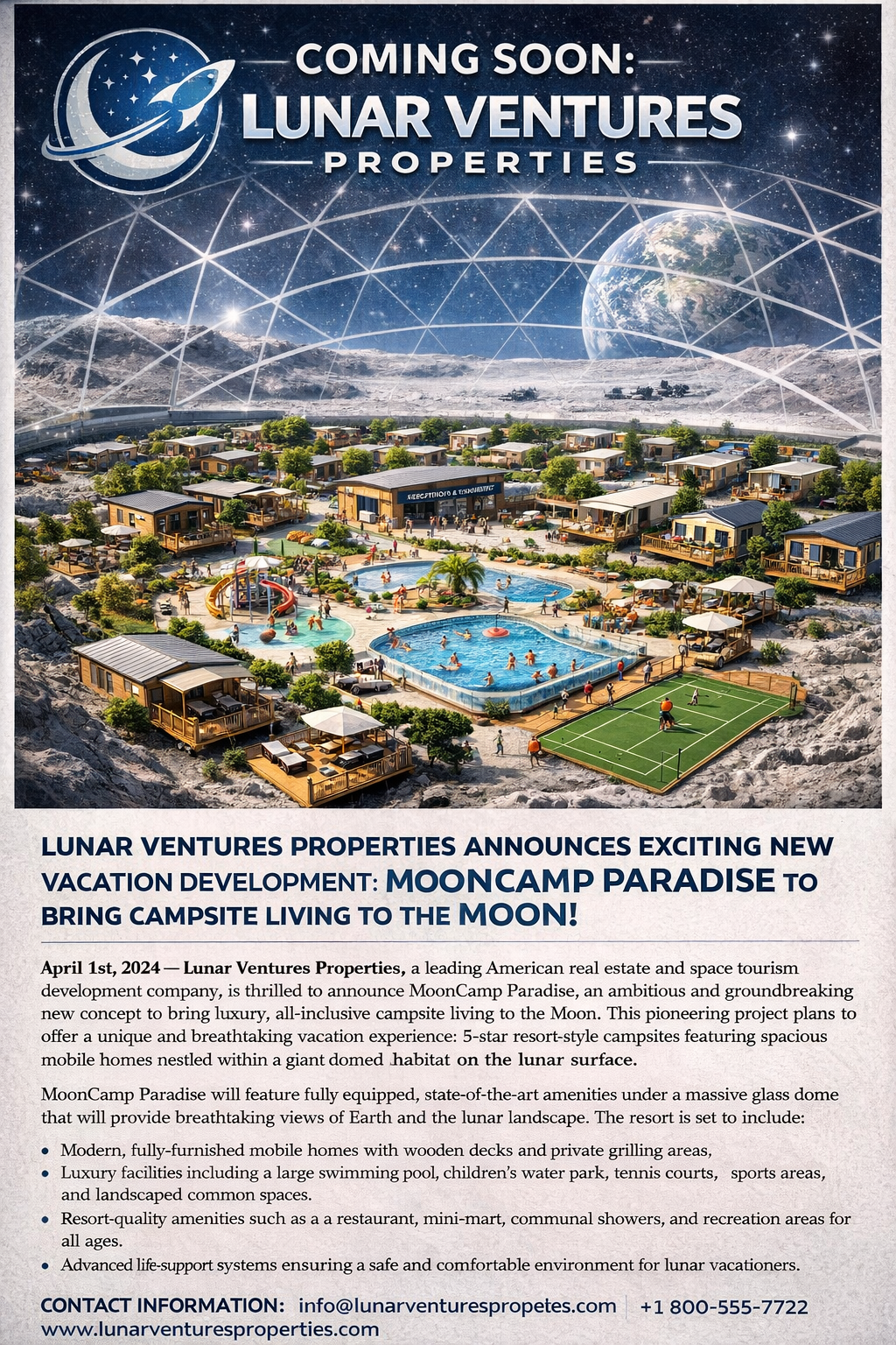 La société américaine Lunar Ventures Properties, spécialisée dans le développement immobilier innovant et le tourisme spatial, annonce aujourd’hui le lancement de son projet le plus ambitieux à ce jour : MoonCamp Paradise, le premier camping résidentiel haut de gamme jamais envisagé sur la surface lunaire.