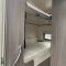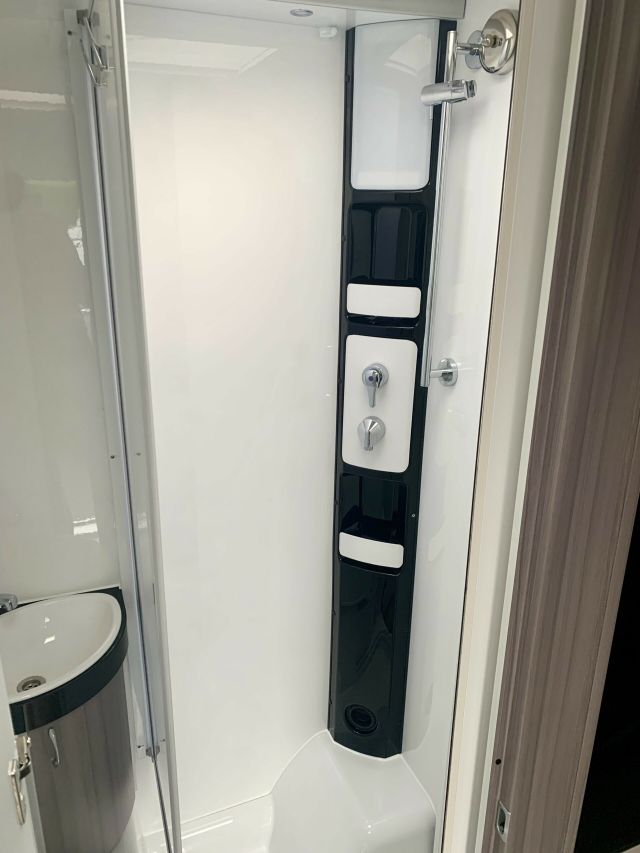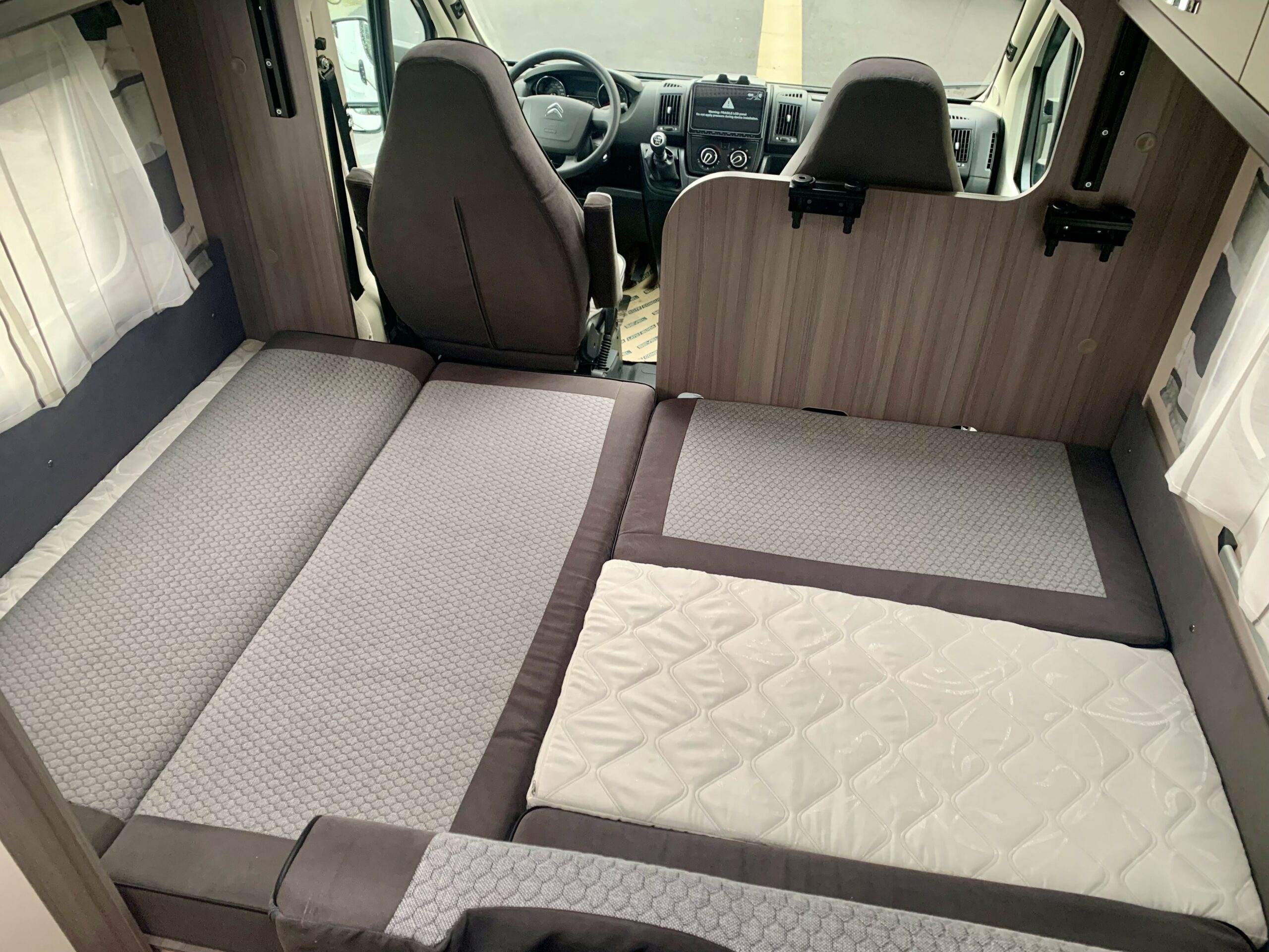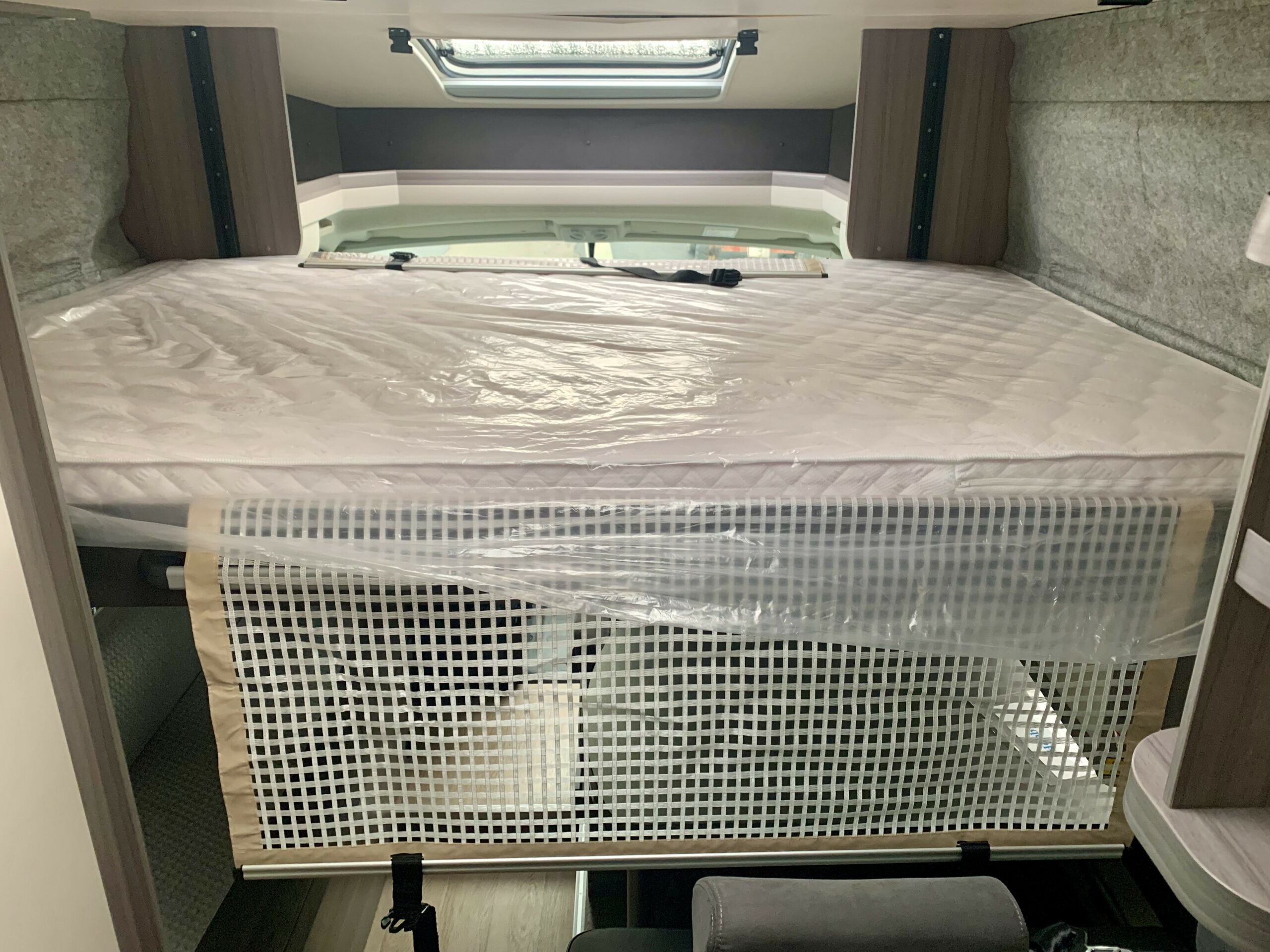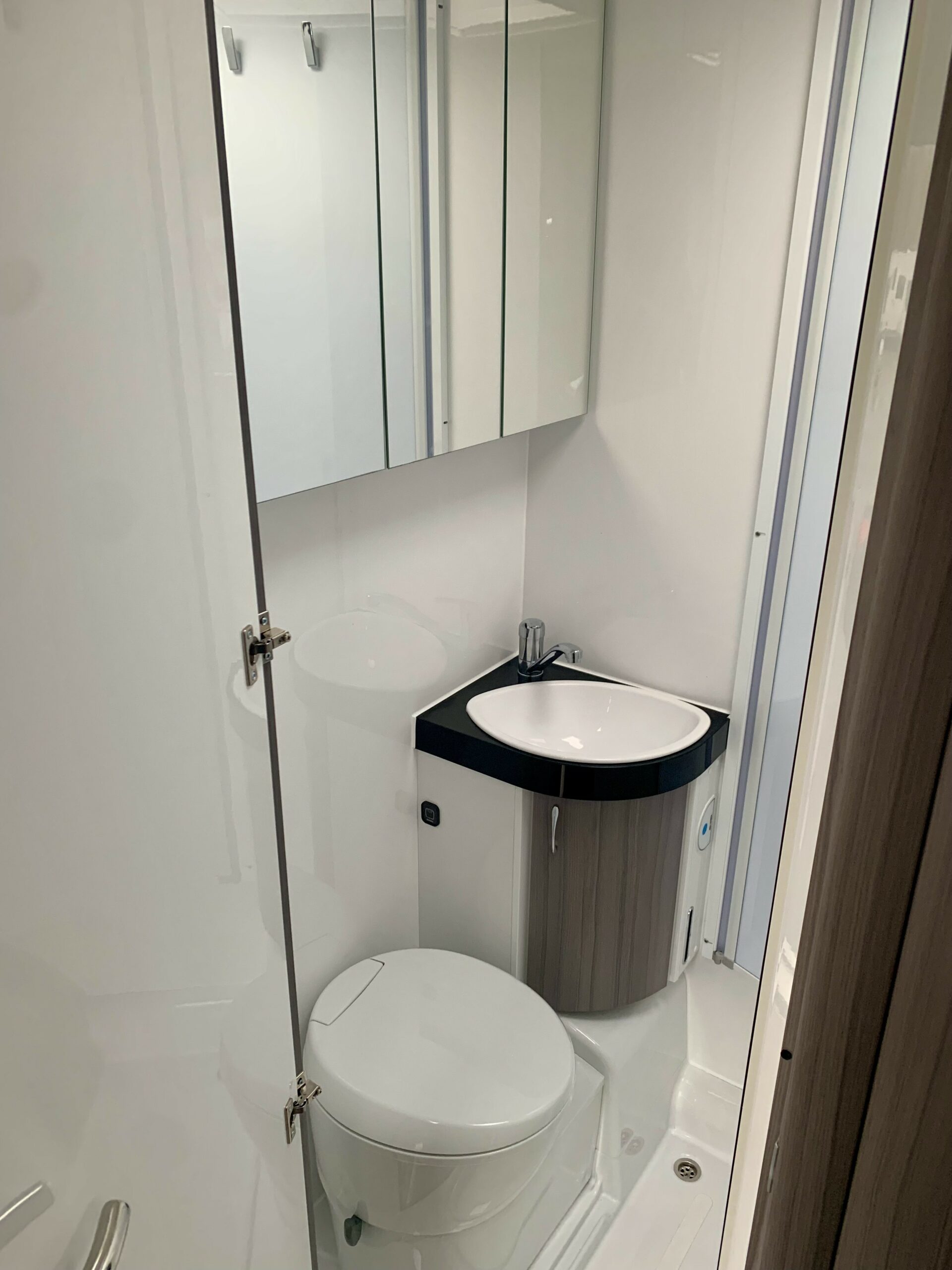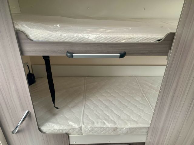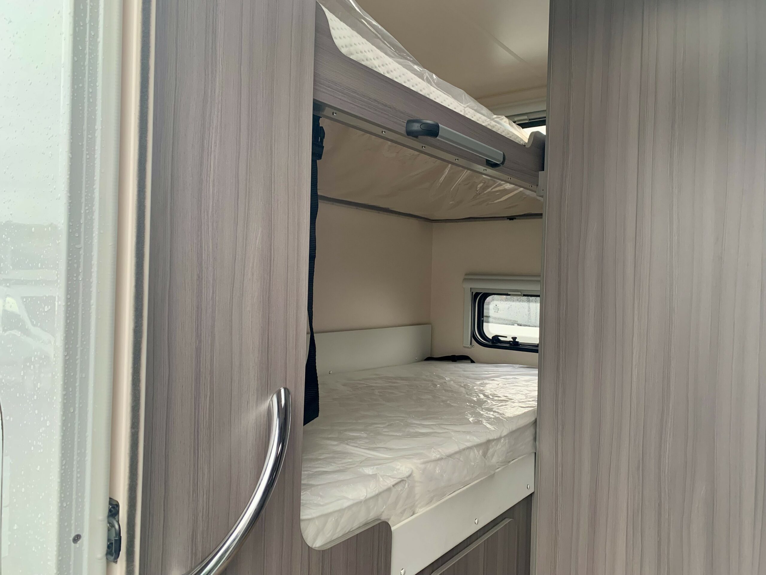 Étagères à épices Range-couverts Couchages Interrupteur lumière dans l’espace couchage Lit de pavillon, mécanique Lits superposés, 2 niveaux, lit inférieur relevable Matelas mousse haute densité Cabinet de toilette Armoire Colonne de douche avec robinetterie de douche et compartiments de rangement Paroi de douche Salle d’eau compacte avec douche intégrée WC pivotant THETFORD TECHNOLOGIE