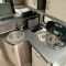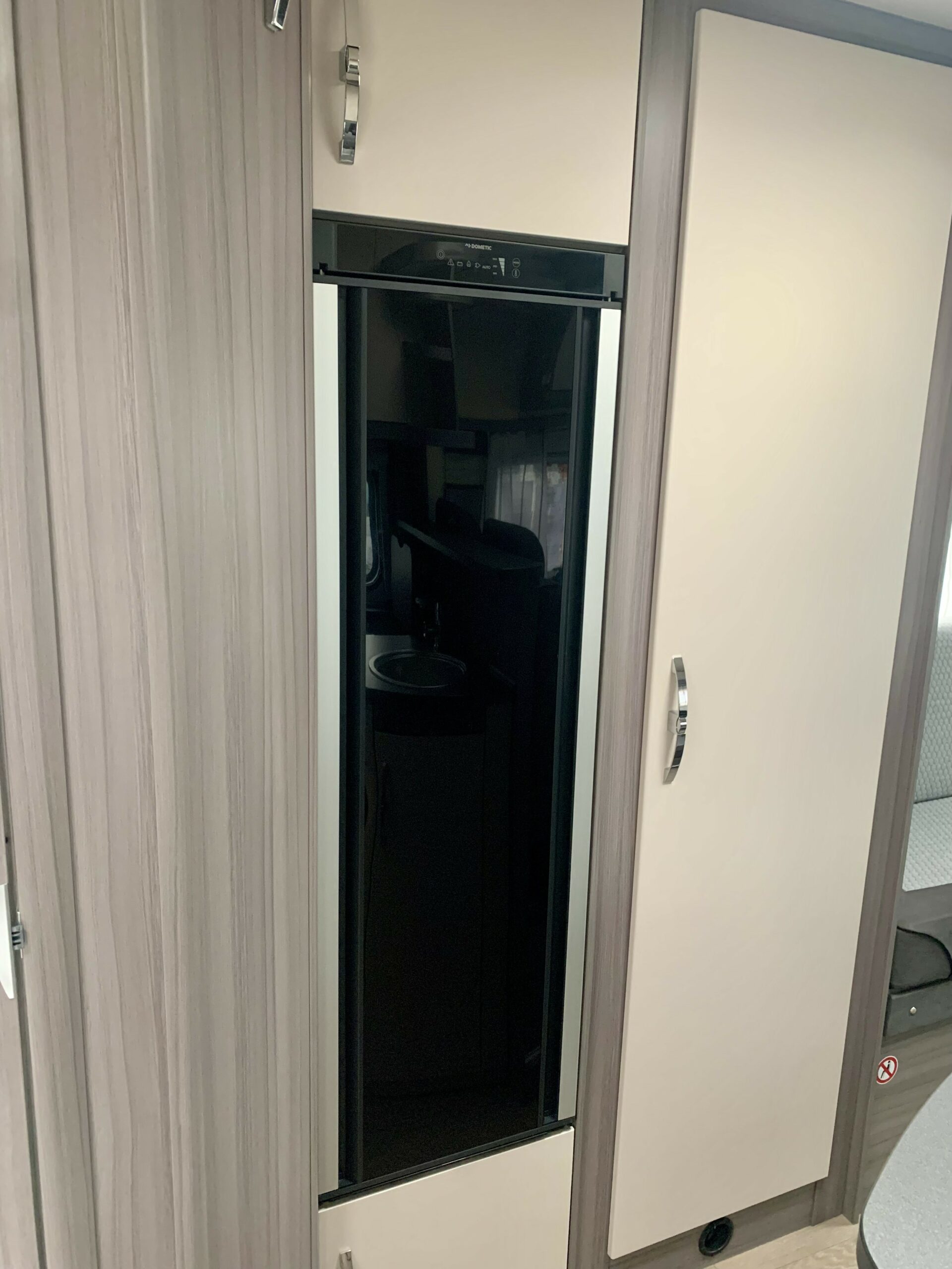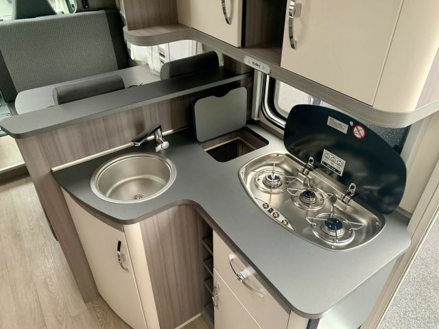 Séjour Armoires de pavillon spacieux Passage sans marche de la cabine de conduite au séjour Penderie avec éclairage intérieur Cuisine Comptoir en cuisine Cuisine équipée de tiroirs de grande taille à extension complète avec Soft Close Évier en acier inoxydable Prises électriques en cuisine Rallonge de plan de travail Réchaud en acier inoxydable à 3 feux, allumage électrique et couvercle en verre Réfrigérateur (AES) DOMETIC, 133 litres, avec double ouverture, à absorption
